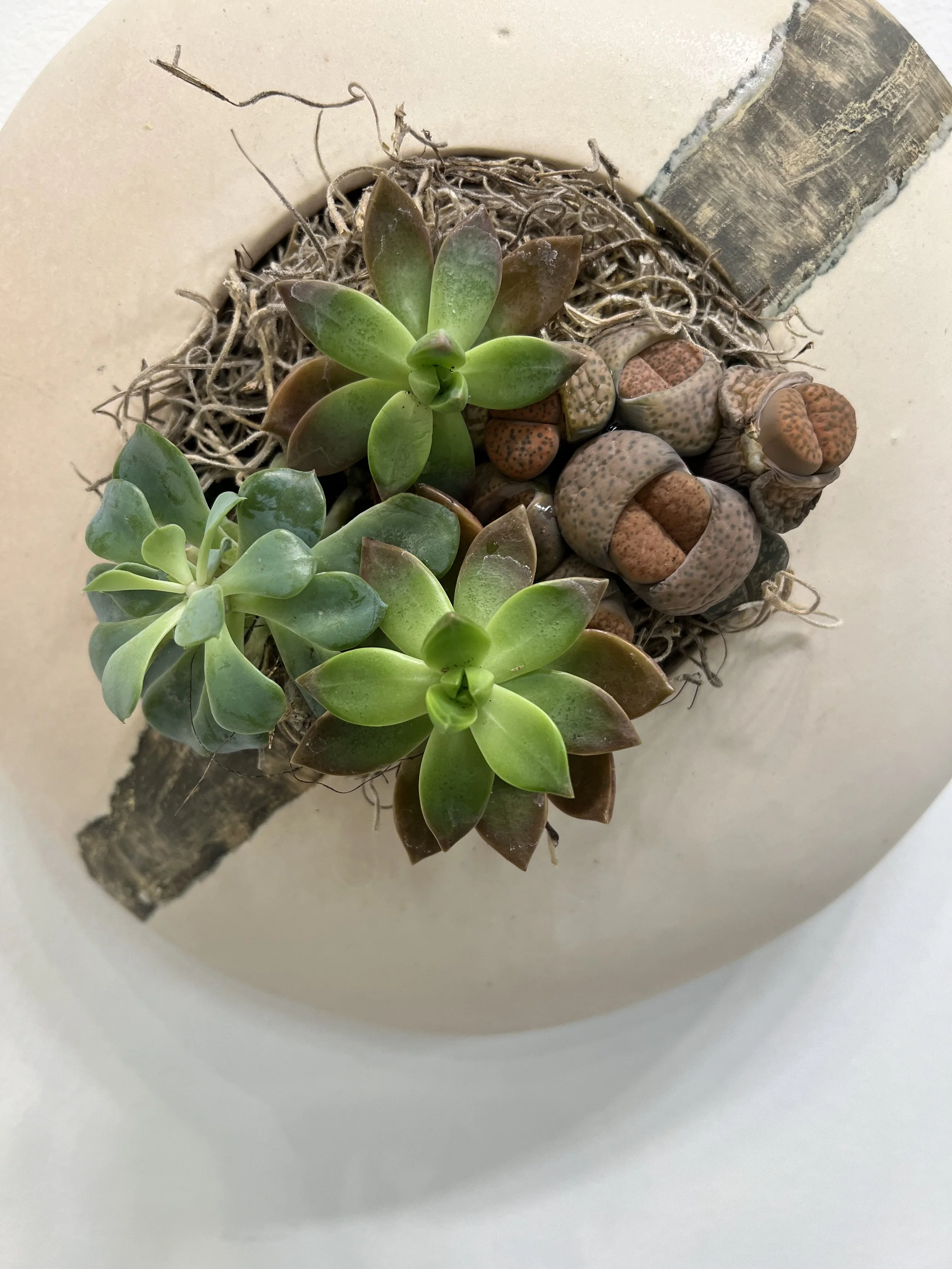 Beth Roland also finds solace and inspiration in the natural world.The wasp nest is a recurring theme in her work-a womb like architectural wonder containing a complex social structure. This work celebrates the beauty and resilience of nature, offering commentary and counterpoint to human systems and structures.